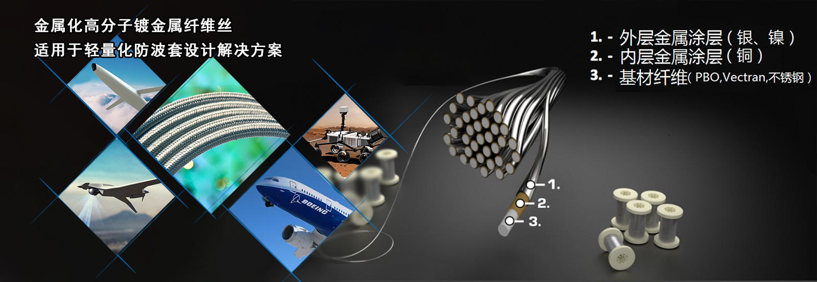 鍍金屬導(dǎo)電纖維絲是在高分子基材上雙層均勻涂鍍金屬,在航空航天線(xiàn)纜減重、機(jī)器人電纜屏蔽層、柔性天線(xiàn)、船舶拖曳電纜等減重和強(qiáng)度性能要求高的精密行業(yè)以更高的性能替代標(biāo)準(zhǔn)銅線(xiàn),用作電纜、線(xiàn)束EMI屏蔽和專(zhuān)用導(dǎo)線(xiàn)。
