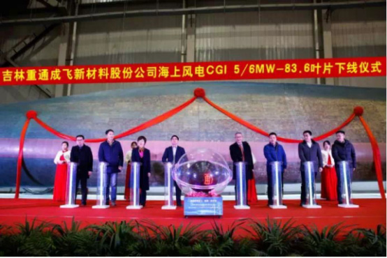 2018年2月6日,吉林重通成飛新材料公司開發(fā)出國(guó)內(nèi)最長(zhǎng)海上風(fēng)電CG15/6MW-83.6米葉片,并在江蘇如東成功下線..